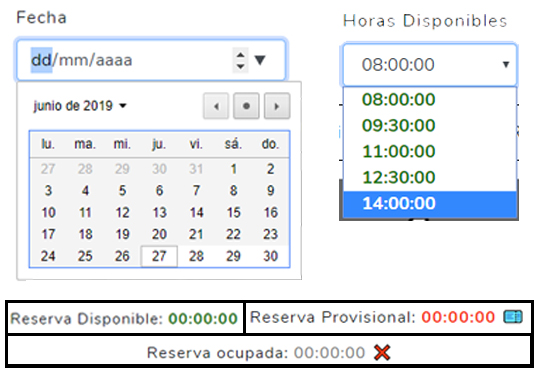 Tenga en cuenta que cuando seleccione una fecha, se cargarán automaticamente las horas que esten disponibles.