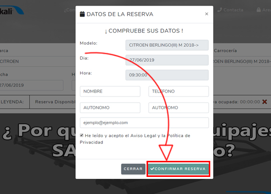 En la ventana que se abre, comprueba que todos los datos del modelo, fecha y hora son correctos. Procede a rellenar los datos personales y de contacto, para finalizar.Por último haga click en el botón de confirmar reserva.